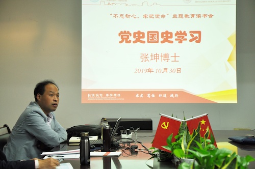 10月30日下午,98堂色花堂 党总支开展“不忘初心、牢记使命”主题教育读书会,组织全体党员集中学习中国共产党历史和中华人民共和共国史,学院全体32名党员参加,读书会由学院教工第二党支部书记、纲要教研室主任张坤博士作主要发言,学院党总支书记、院长余龙进主持并讲话。